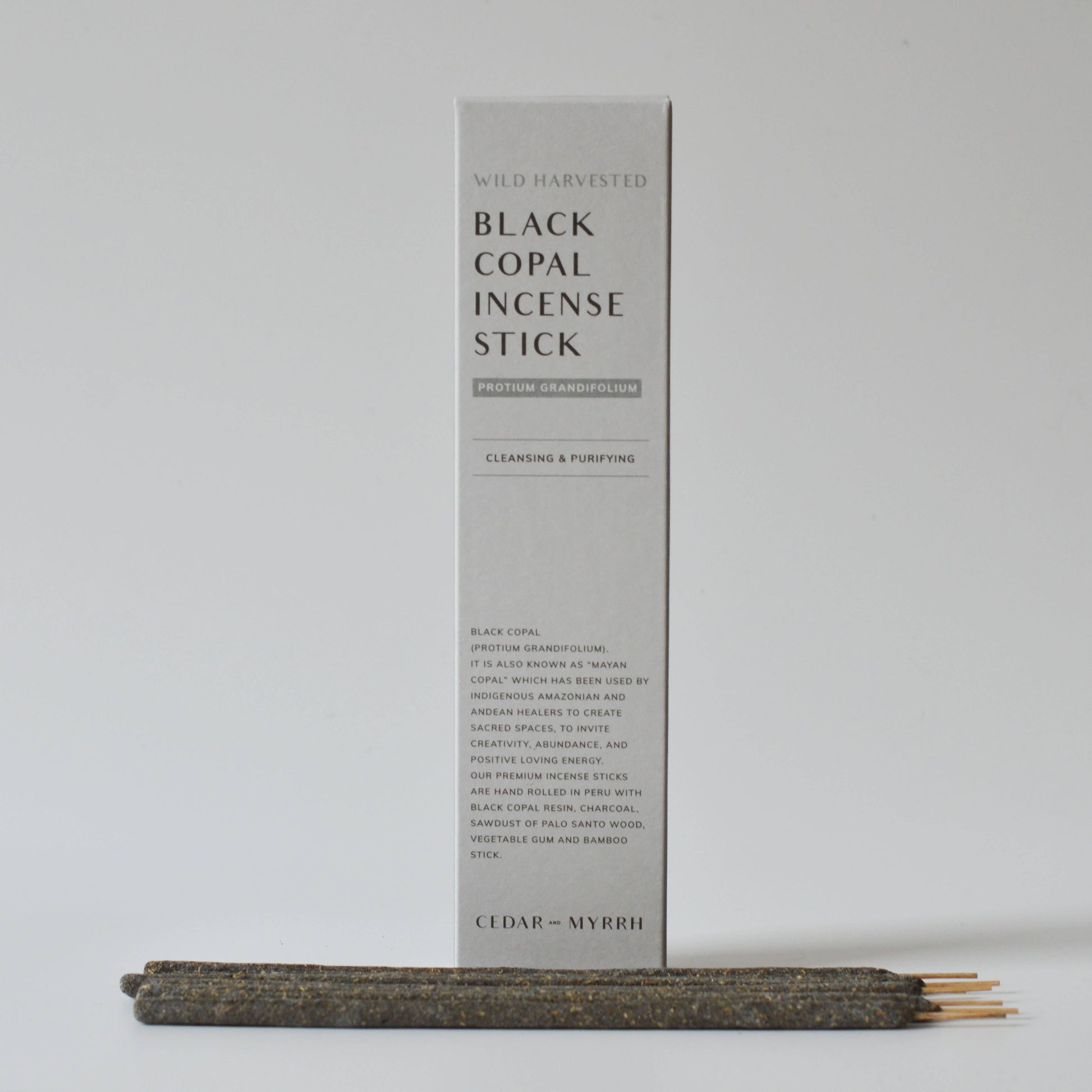 Our premium Incense Sticks are hand rolled in Peru with Black Copal resin, Charcoal, sawdust of Palo Santo wood, vegetable gum and bamboo stick.