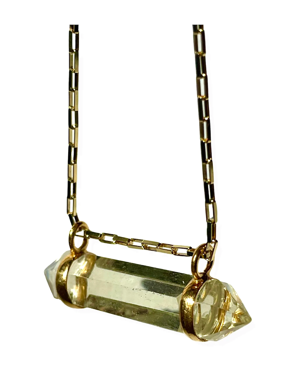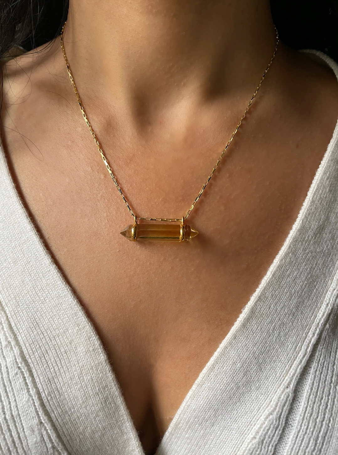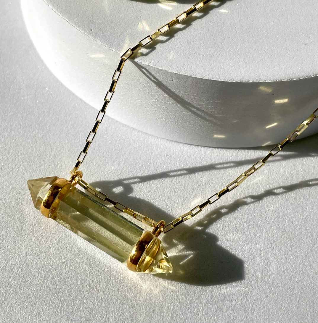 The word celestial often references something outer worldly, the cosmos, the heavens and or something that is supremely good! Designed to carry a supercharged crystal cut in a fashionable way by Quartz & Canary, this pendant is truly sent from the heavens! A double terminated faceted bar cut shine beautifully in natural citrine. A statement and a spiritual amulet all at the same time!