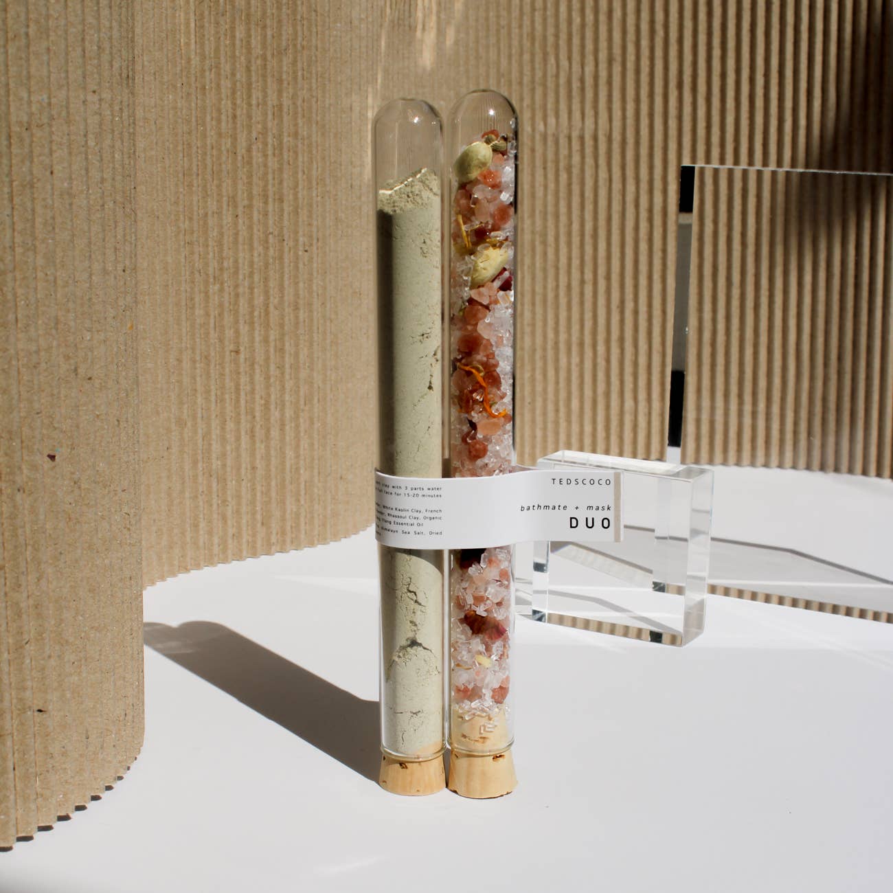 Bathmate Elements: Epsom Salt, Pink Himalayan Crystal Salt, Organic Dried Jasmine Flowers, Organic Dried Rose Flowers, Organic Dried Calendula Flowers, Organic Essential Oil Blend Clay Mask Elements: Organic Aloe Powder, White Kaolin Clay, French Green Clay, Organic Chamomile Powder, Rhassoul Clay, Organic White Willow Extract, Organic Ylang Ylang Essential Oil Bottle Size: 1-ounce tube of each | 28 grams 100% Organic flowers/powders/extracts/oil, Vegan, and Cruelty-Free Certified